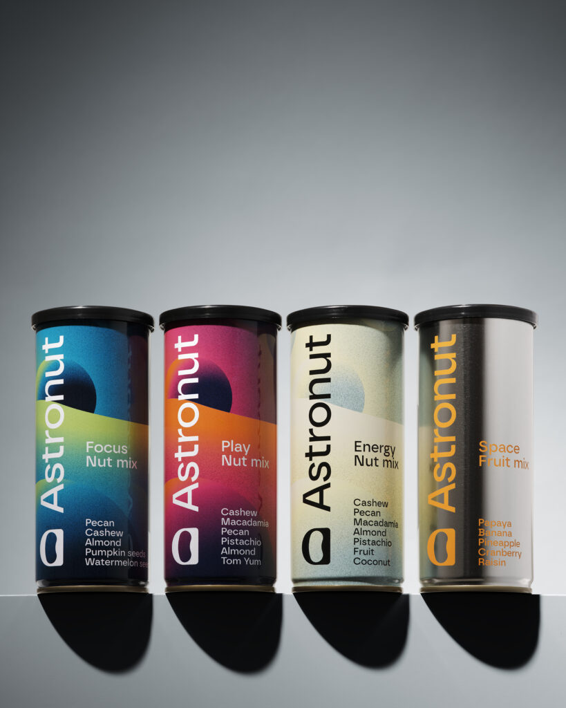 Så här ser våra första fyra nötmixar ut. Premiumnötter och snyggt designad burk med unikt goda mixar. Responsen har varit enorm. Produktion av burk och nötter sker i ett samarbete med en fabrik i Bangkok.