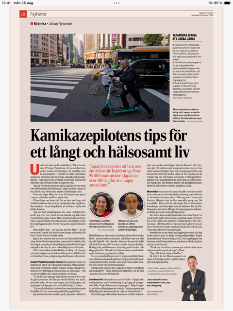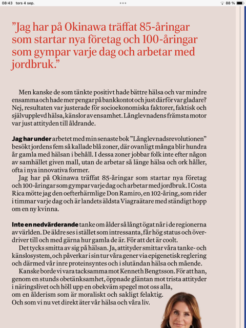Den här artikeln (Di 25/8) om japanerna och Japan där andelen 100-åringar är flest i hela världen säger samma sak. Fortsätt arbeta så länge du kan så lever du längre. Sen kan ju arbetsinsatsen och arbetsuppgifter se annorlunda under olika faser i livet, men att ha olika projekt igång är nog nyttigt för de allra flesta.